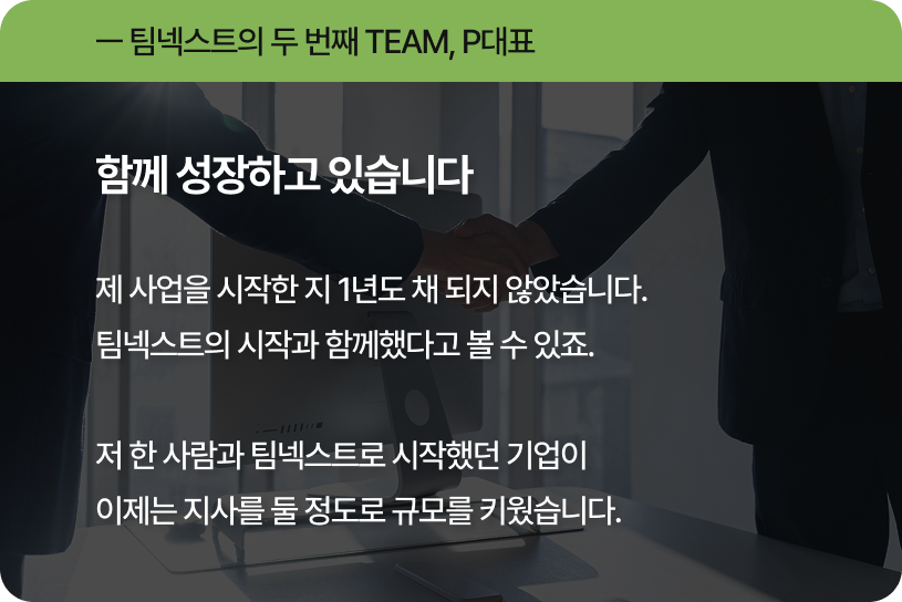 회사의 성장과 NEXT를 함께 고민하고 실행할 파트너를 찾는 브랜드를 위해 존재합니다.